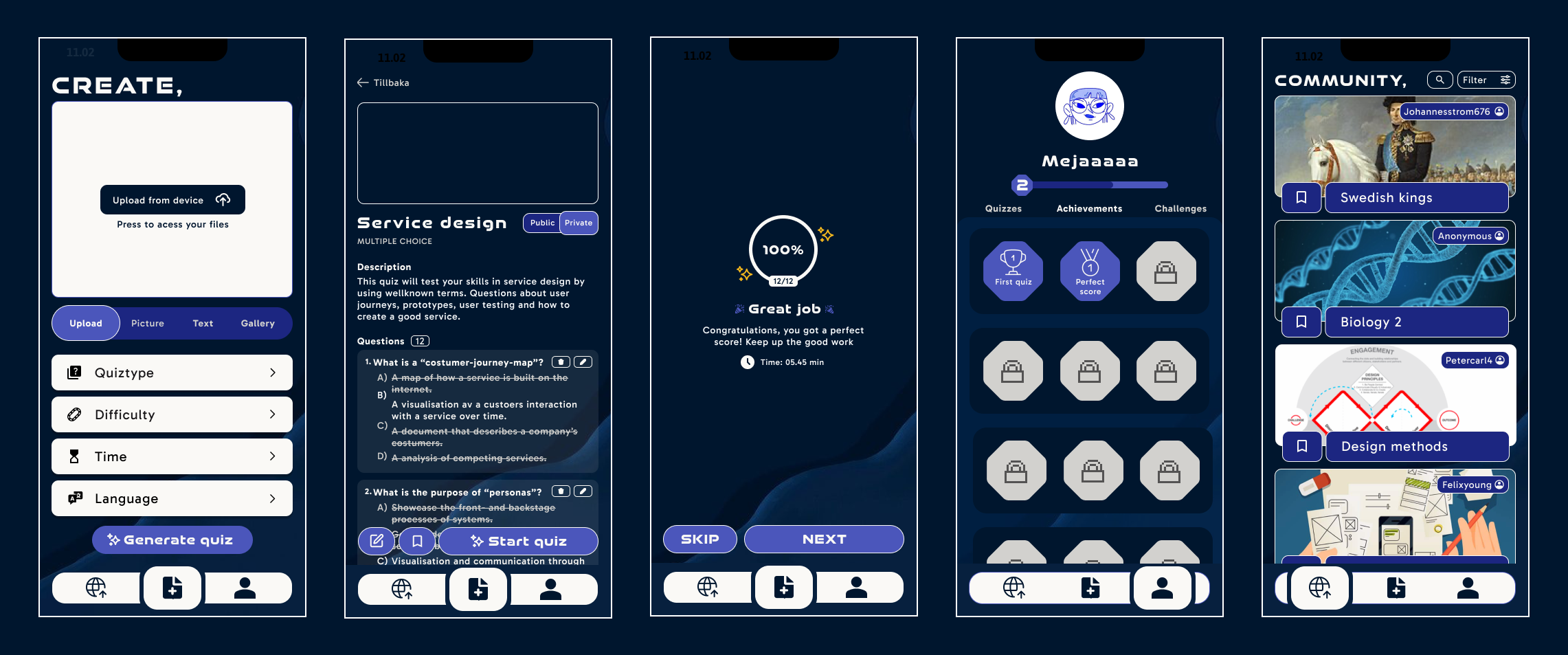 * Note that the Figma prototypes are not fully developed. 1) Create new quiz, 2) Created quiz is presented and open for edits, 3) Congratulations! You finished your first quiz, 4) Profile and personal achievements 5) Community with easy accessible quizzes.