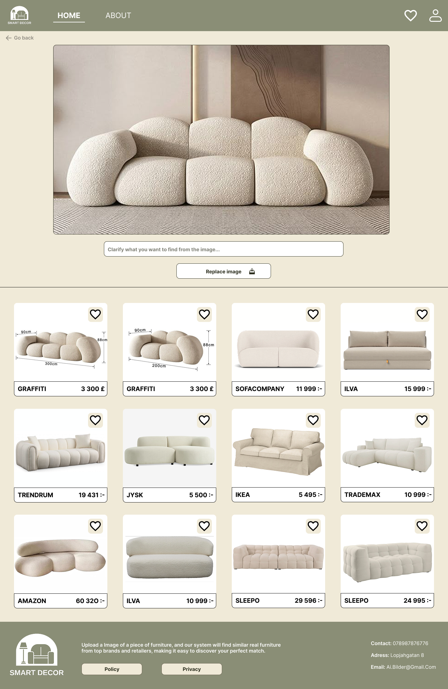 The website was created as part of my "Frond-end programming" course at Halmstad University. Togheter with my team, I aimed to discover an innovative tool to help users find furniture they've seen online but cannot identify, or similar, easy available options. I used
